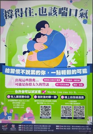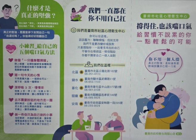各位男性同胞, 刻板印象-男性是堅強的!「撐得住,也該喘口氣,給習慣不說累的你一點輕鬆的可能,真正的堅強,是知道什麼時候讓自己鬆一口氣」,男性自殺率逐年攀升,且多數個案於首次通報時即已死亡,研判與男性較不願主動求助之文化因素相關。臺南市府衛生局暨關廟區公所宣導「男性關懷」專線及心理健康相關資源,以破除「求助即為軟弱」等迷思,並鼓勵男性提升自我覺察、善用心理健康支持管道。